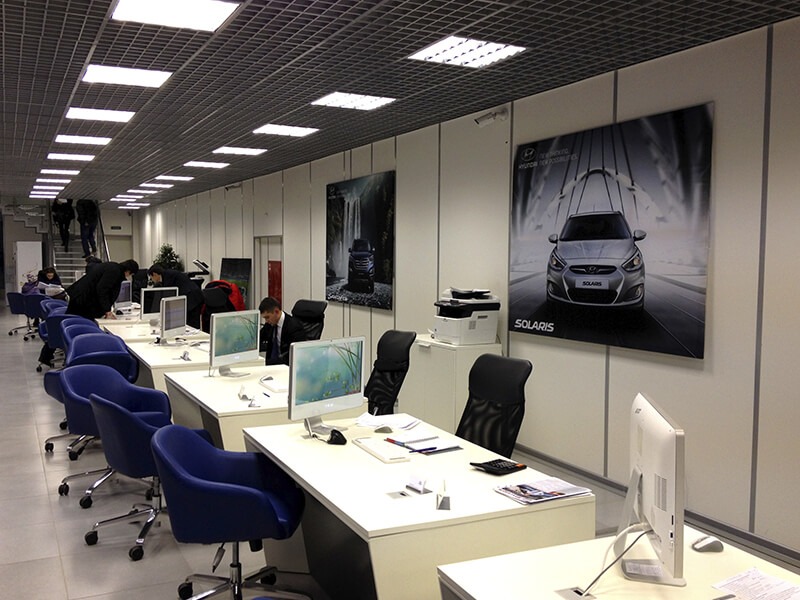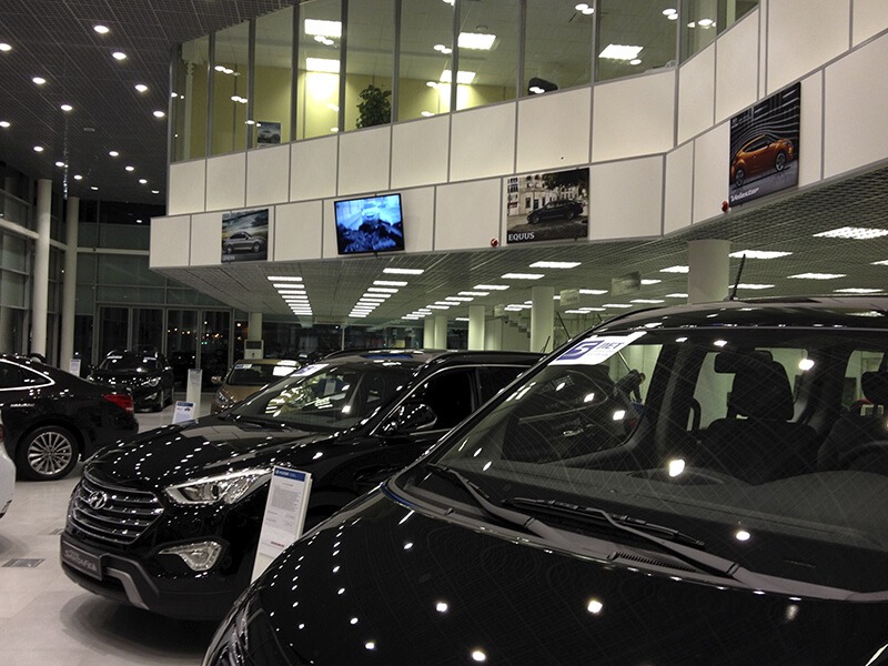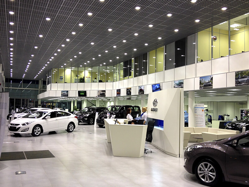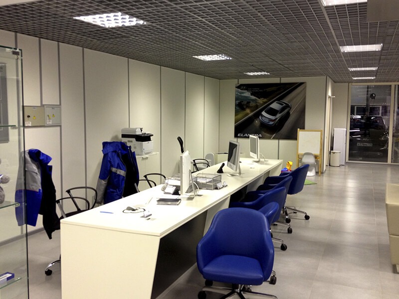 В качестве внутренней отделки стен автосалона использовались стеновые панели Випрок, которые предназначены для помещений с высокой интенсивностью движения.