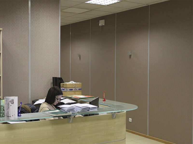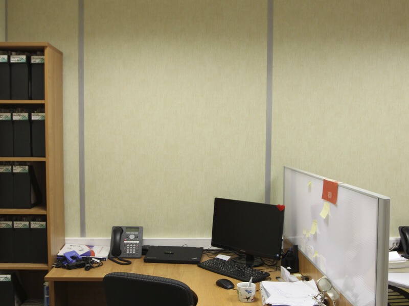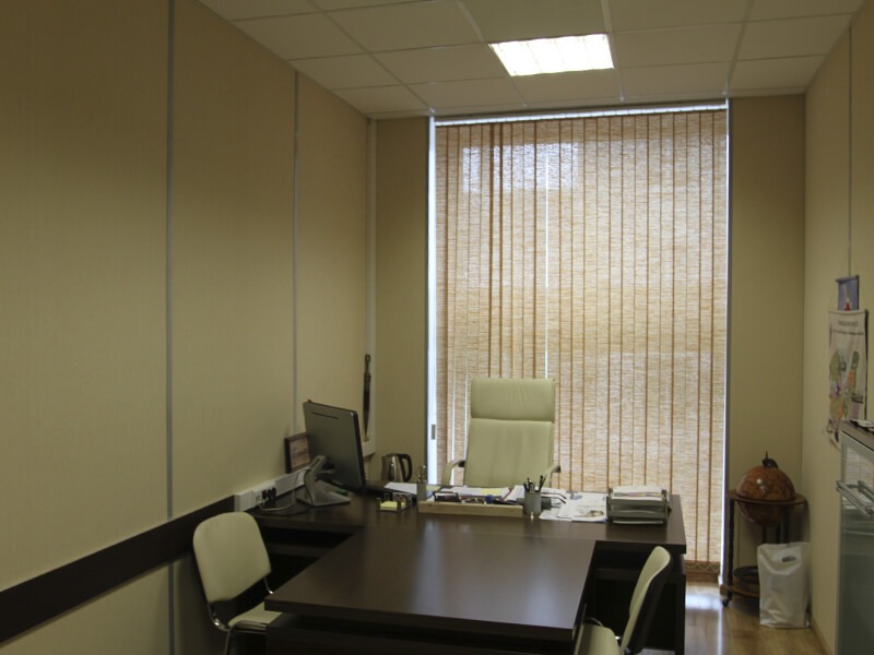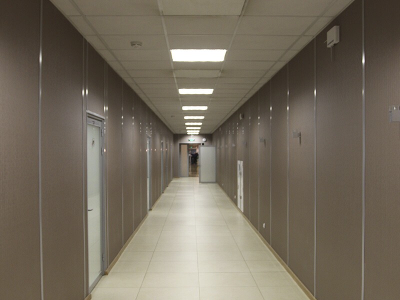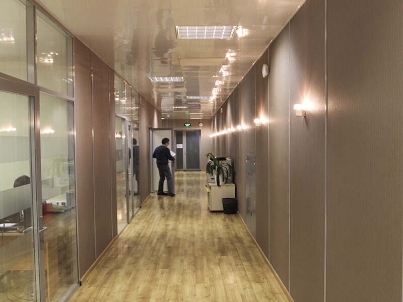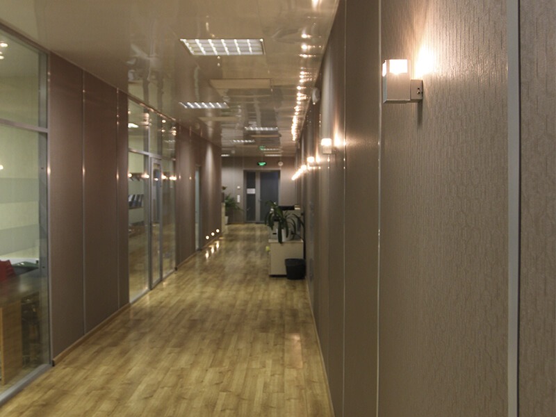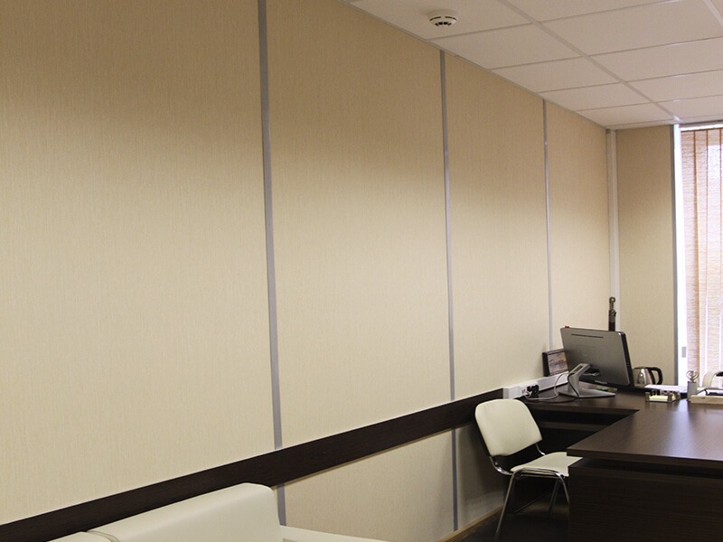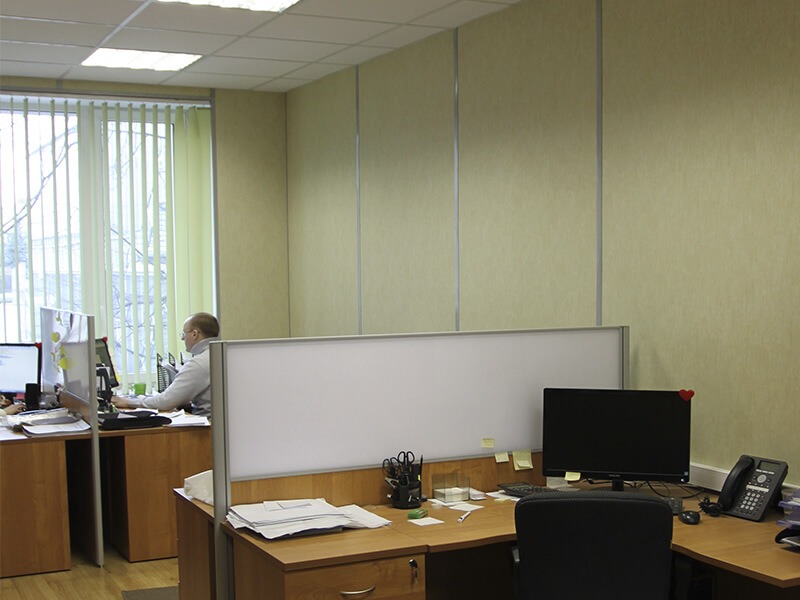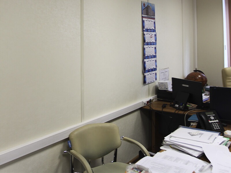 Отделка стен офисов компании выполнена декоративными стеновыми панелями Випрок с имитацией текстиля и штукатурки: