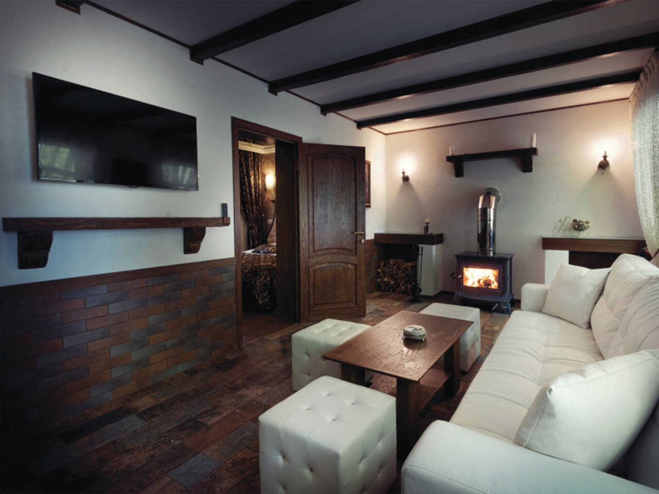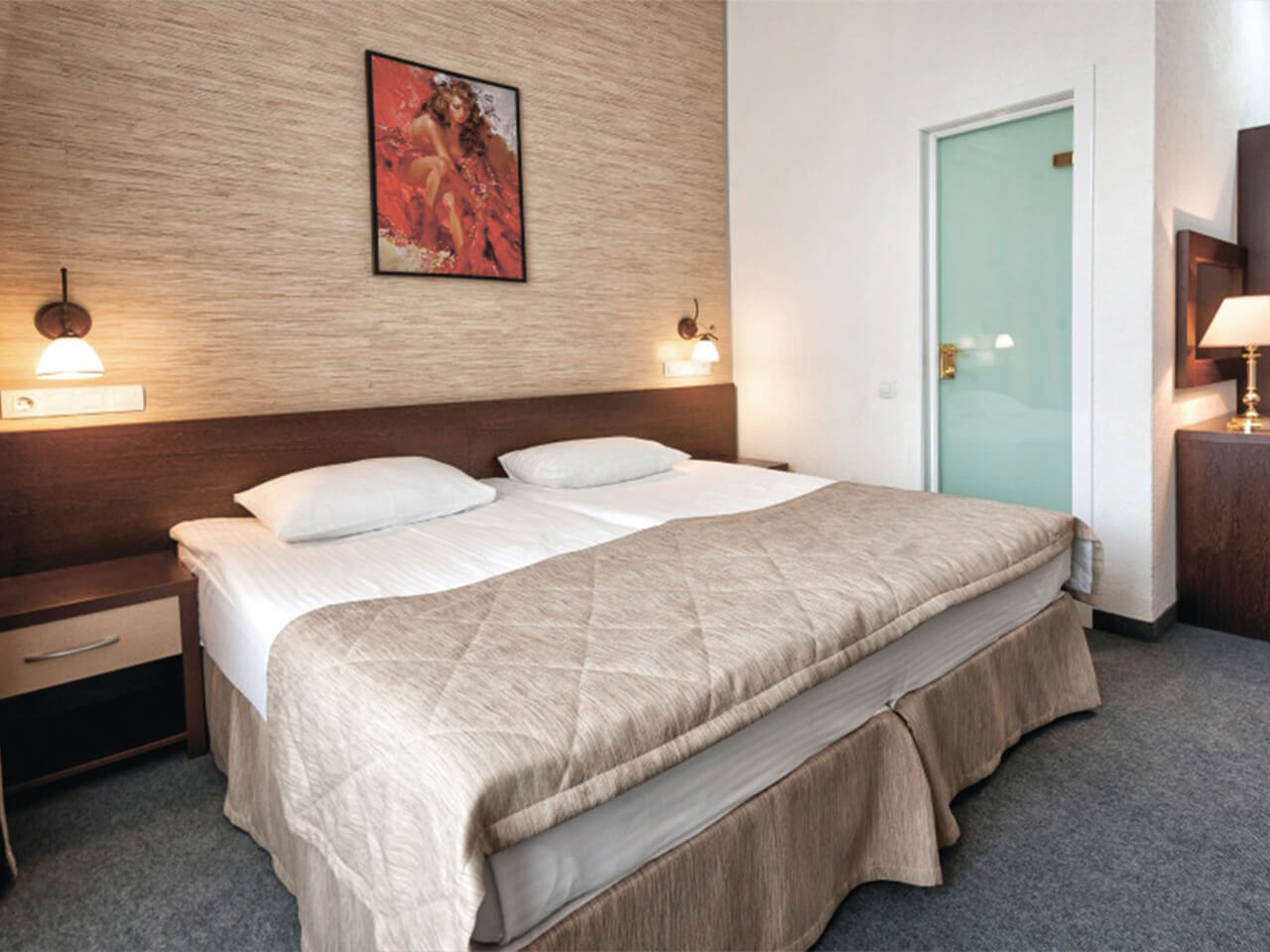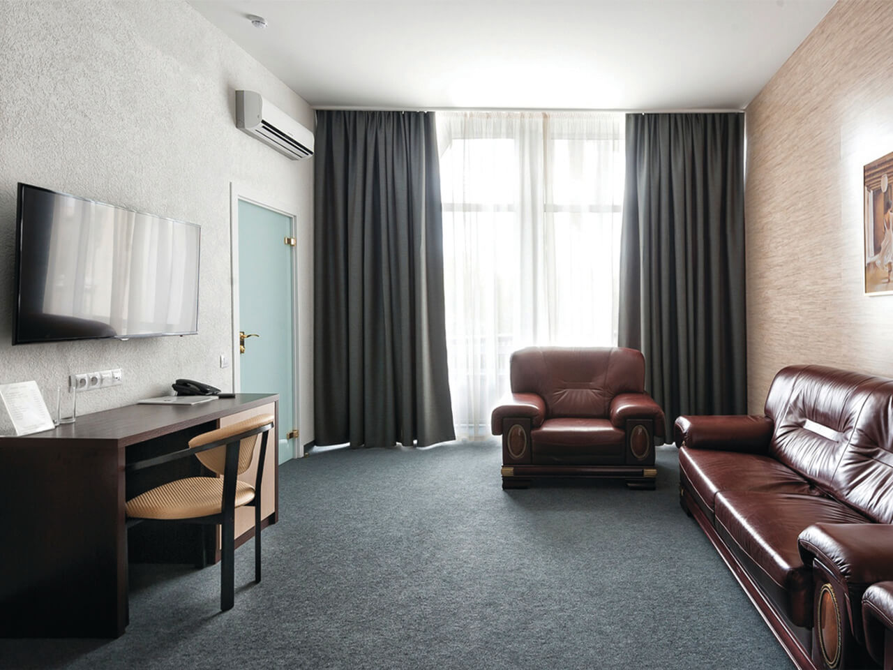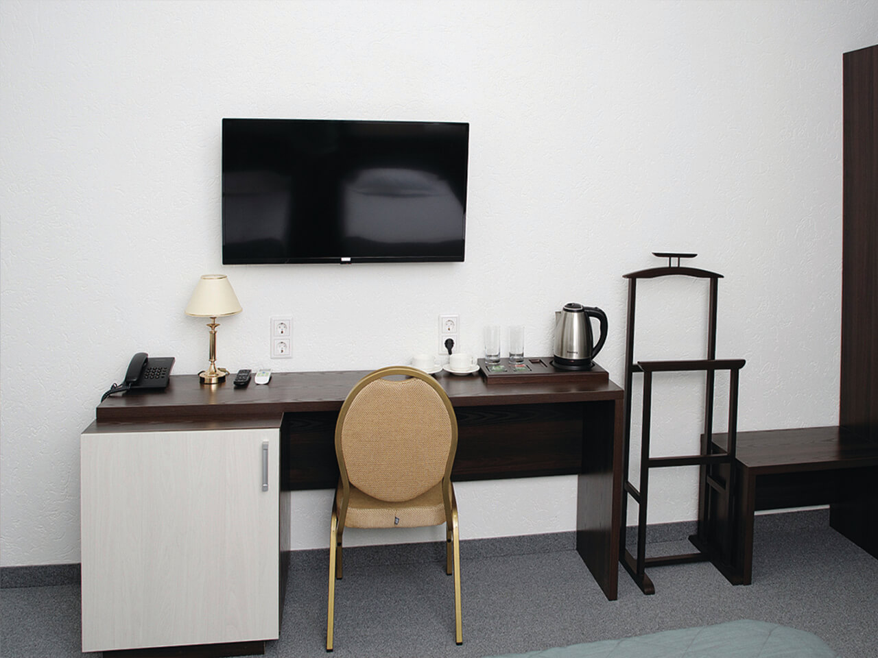 В номерах гостиницы, в качестве внутренней отделки стен, использованы антивандальные обои с имитацией текстиля: