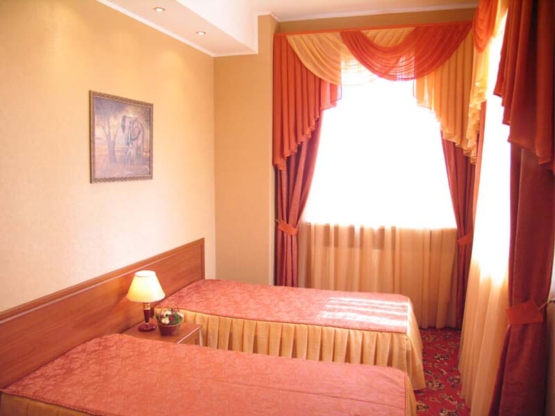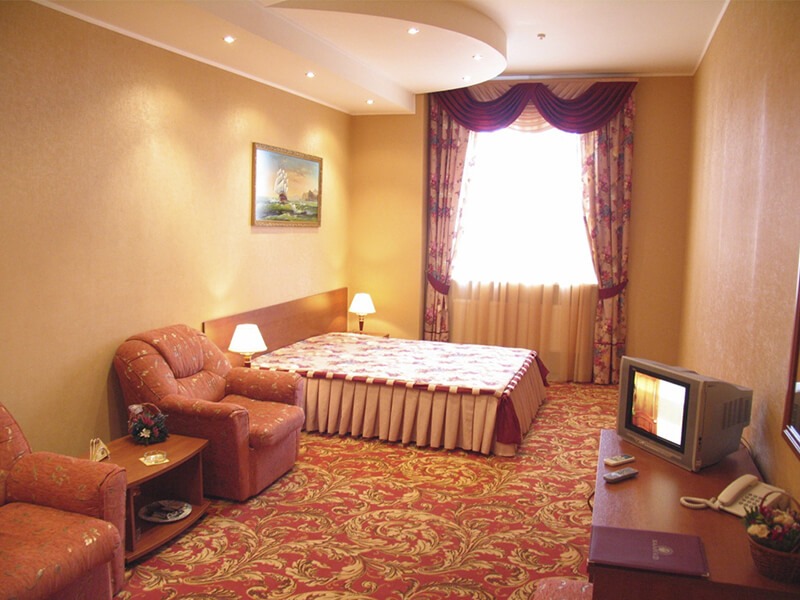 Отделка стен номеров развлекательного комплекса выполнена антивандальными обоями, с имитацией штукатурки: