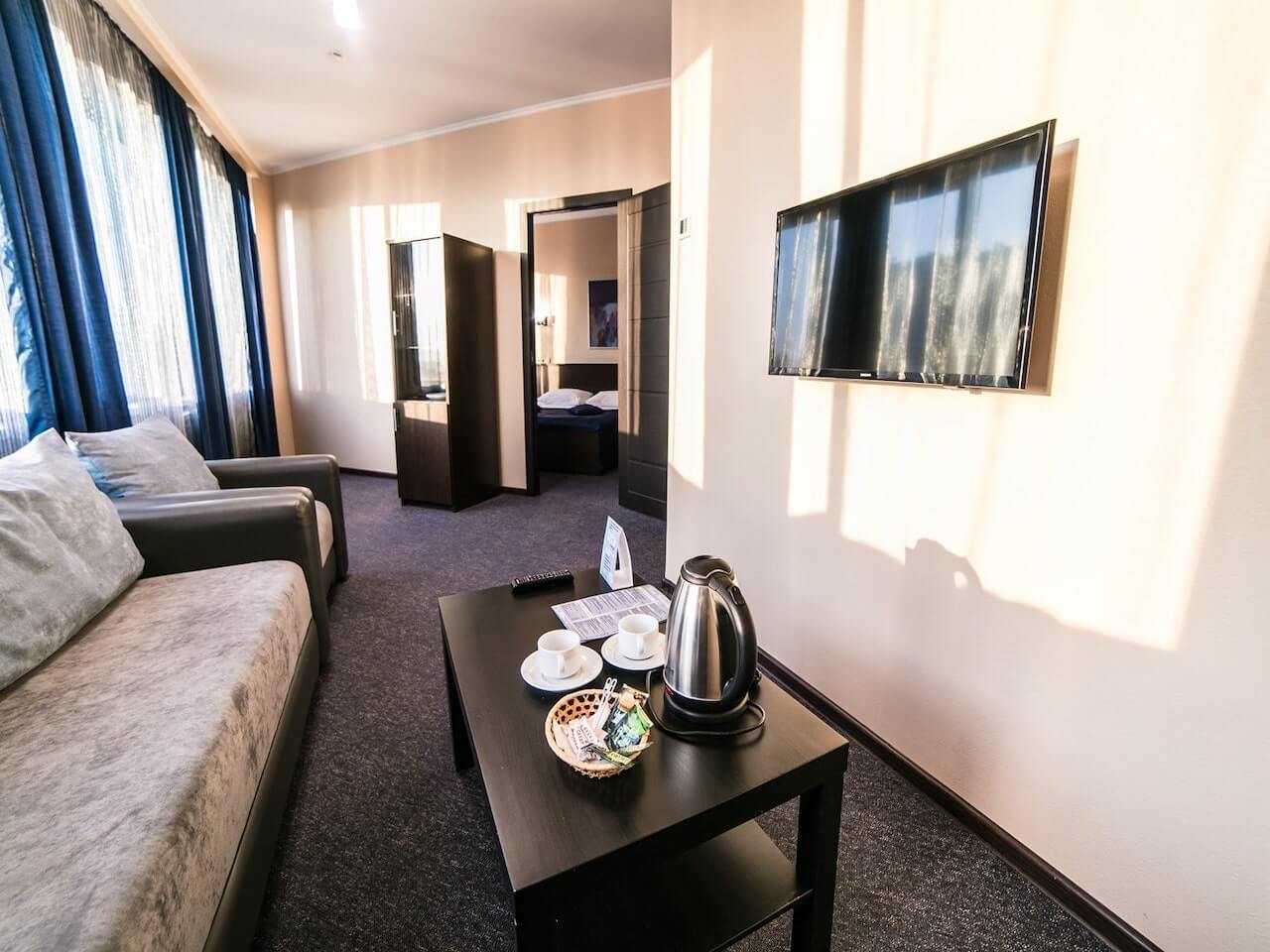 При отделке стен гостиницы использовались экологичные, износостойкие антивандальные обои с имитацией волокон:
