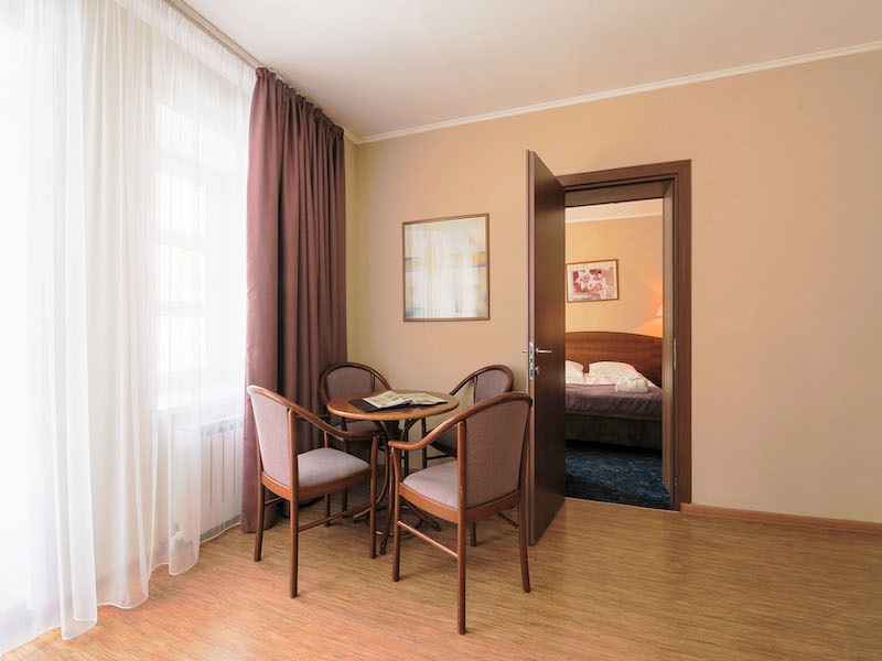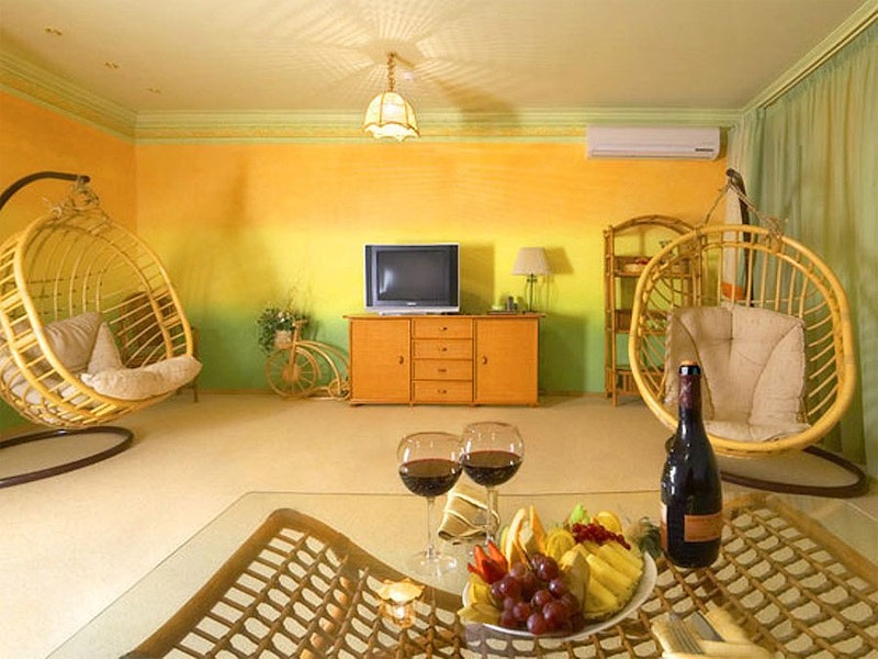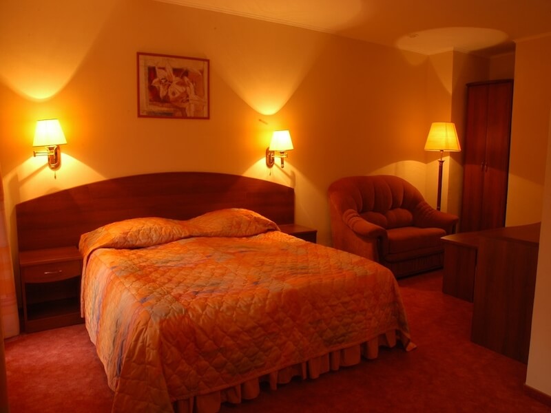 Отделка стен гостиничных номеров выполнена прочными, экологичными антивандальными обоями: